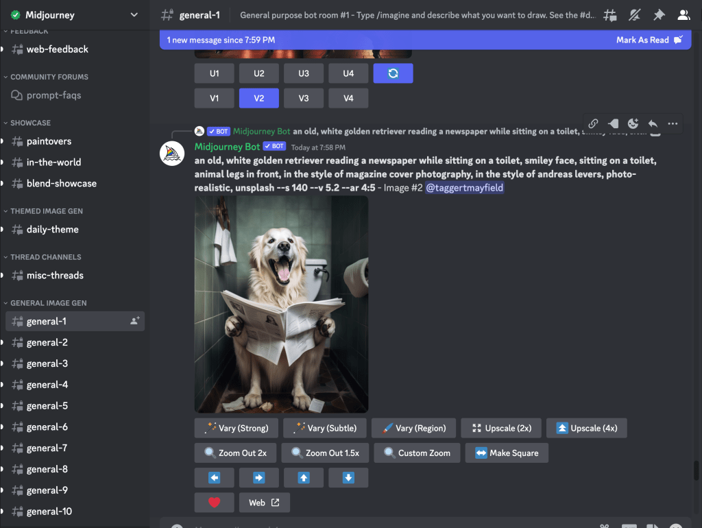 Let’s get back to what Mid Journey is doing. Once you’re in their discord you’re able to see a multitude of channels for image generation. Some are just playgrounds, and others are for specific themes of images. Now you might be wondering how can I even generate an image in a chat app like Discord. That’s where Discords power starts to shine. With Discord you’re able to build in your custom plugins that you can use within your server, and your users can access them using commands within the chat bar. For example in Mid Journey you can go to a general channel and type the command /imagine prompt and it’ll start executing it in that channel! Give it a few seconds then π₯ BAM! Your newly generated is available. After that you can view a live feed of other members in the Discord generating their own images, inspiring you to try something new out.